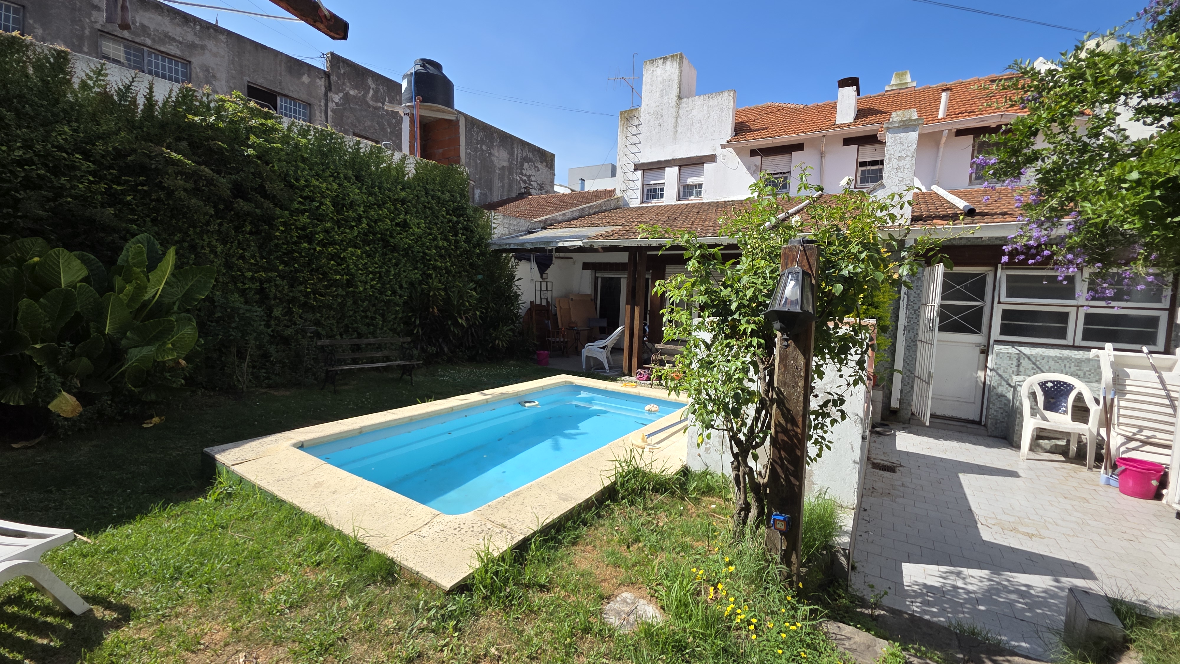 Parque con piscina y parrilla.
